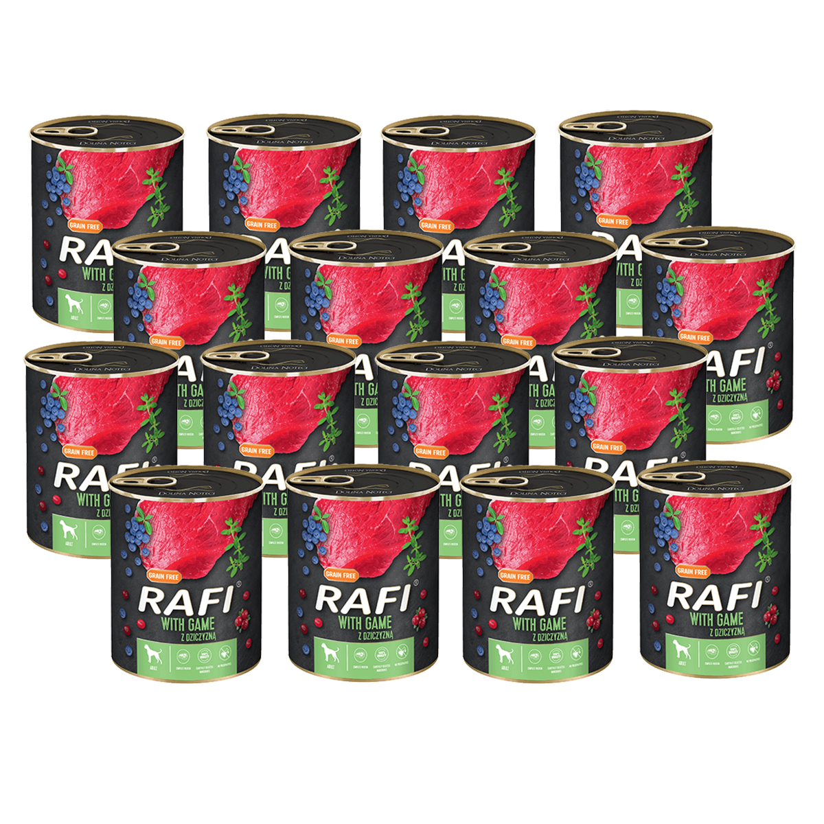 Mokra karma Rafi z dziczyzną charakteryzuje się wysoką zawartością pełnowartościowego białka oraz nienasyconych kwasów tłuszczowych, głównie n-3 odpowiedzialnych za wspieranie odporności. Mięso i surowce pochodzące z dziczyzny uzupełniają recepturę o aminokwasy – metioninę, izoleucynę i cystynę. Karma zawiera selen i miedź w ilościach pokrywających zapotrzebowanie dorosłego psa. Dodatek owoców: borówki amerykańskiej i żurawiny, dzięki występującym w nich związkach biologicznie czynnych, głównie procyjanidyn i flawonoidów, wykazuje silne właściwości przeciwutleniające i przeciwzapalne. Z kolei tymianek sprawia, że karma jest bardziej smakowita.