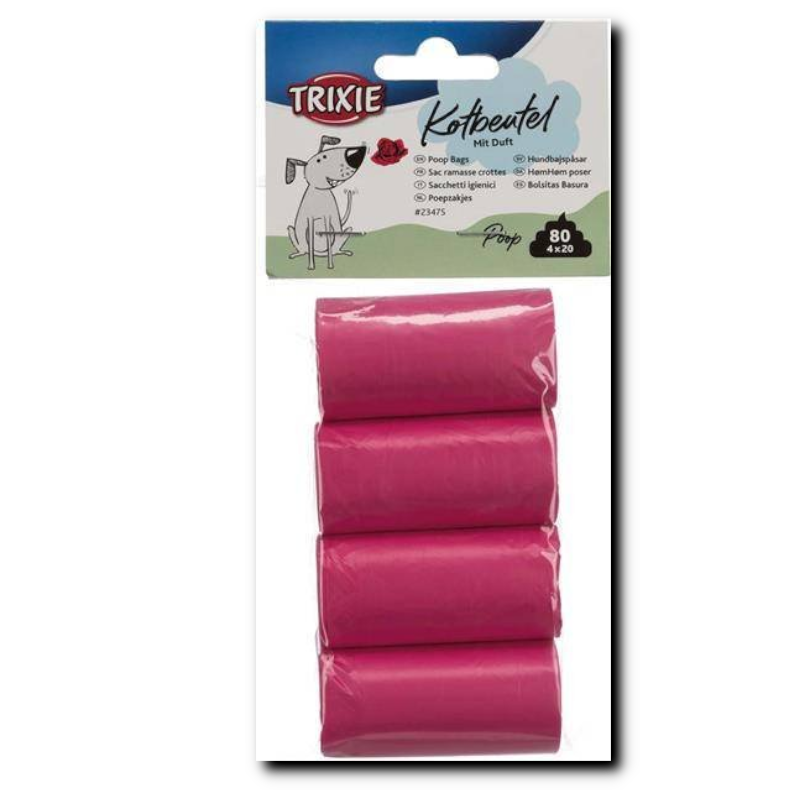 Poręczne i wytrzymałe woreczki plastikowe na odchody – 4 rolki po 20 sztuk. Pasują do wszystkich breloków Trixie. Różany zapach neutralizuje brzydkie zapachy.